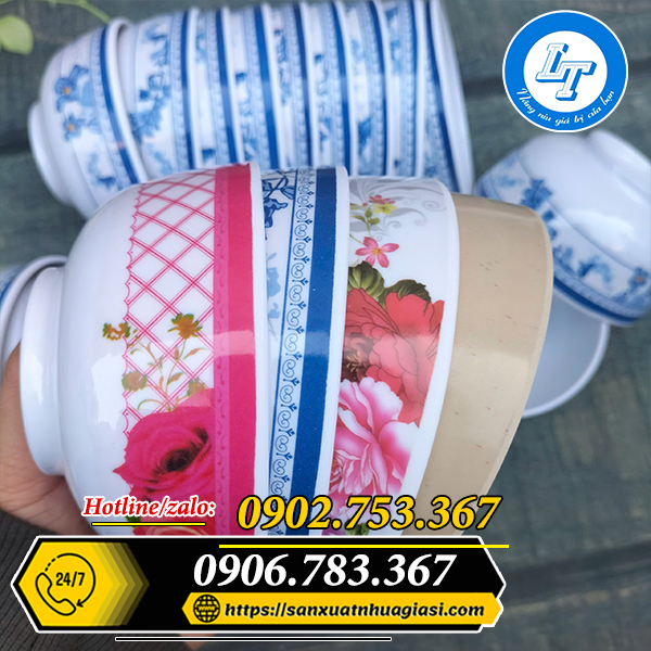 Ngoài loại màu trơn phổ biến thì chén nhựa còn mẫu yêu thích khác là họa tiết chén in hoa: In viền hoa văn rực rỡ, có mẫu hoa hồng, mẫu hoa cúc, phối xanh lam hoặc đỏ nổi bật. Các họa tiết đều được ép in kỹ, bền màu, không bong tróc trong quá trình sử dụng, giúp bàn ăn thêm phần sinh động và bắt mắt.